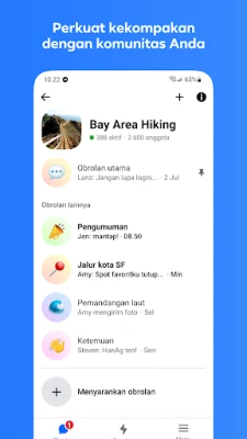 Lebih dari sekadar obrolan, Messenger memungkinkan Anda membangun dan memelihara komunitas yang bermakna. Ciptakan kebersamaan yang tak terlupakan dengan membuat album bersama, baik itu dari liburan terbaru maupun perayaan ulang tahun istimewa, untuk menata dan mengenang momen penting bersama dalam obrolan grup. Bagikan ide dan pekerjaan dengan mudah berkat kemampuan mengirimkan file besar hingga 100 MB, termasuk dokumen Word, PDF, atau Excel, langsung dalam percakapan Anda. Jalin hubungan mendalam dengan individu-individu di lingkungan sekolah, tempat tinggal, atau kelompok minat Anda. Ikuti perkembangan terbaru dari kreator favorit Anda dengan bergabung ke saluran siaran mereka, mendapatkan akses ke konten yang lebih otentik dan kasual.